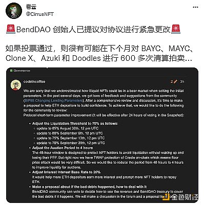 8 月 23 日,BendDAO 通過了緊急參數更新提案,將清算門檻從 95% 逐步降低到截至 9 月 20 日的 70%。此外,DAO 還同意將競標鎖定期從 48 小時縮短至 4 小時。?