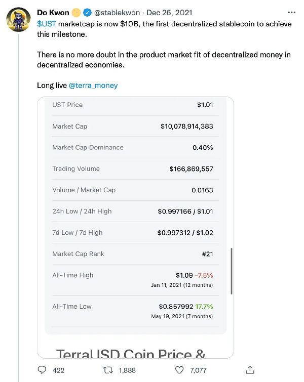 Do Kwon促進了 UST 的增長,UST 是一種由補貼獎勵推動的算法穩定幣,后來在 2022 年初崩潰,曾達到 20B 美元的峰值。