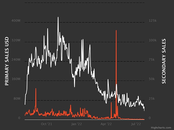 一級市場和二級市場的關系。即使在熊市的情況下,二級銷售市場也主導了一級銷售市場,下圖中,紅色代表一級市場銷售額(美元),白色代表二級市場銷售,很明顯,在數據區間內,NFT市場的二級銷售業務在總銷售中的份額占主導地位,同樣,在目前的熊市格局下,一級和二級市場的銷售總額都已經明顯下降。