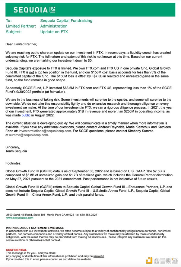 紅杉資本在周三發布郵件稱,公司已經將其FTX投資的價值減記至零。紅杉資本告知投資人,去年公司在FTX的國際和美國業務上投入約2.14億美元。另外據公司發言人表示,投資包括在FTX.com和 FTX.us的持股。