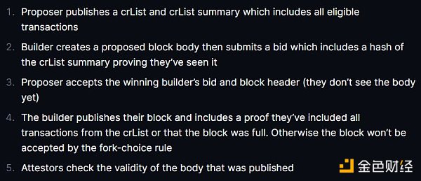 此外,還有一個處理抗審查的完整流程。令人擔憂的是,建設者可能會選擇只允許區塊包含特定交易。關于提議者(即驗證者)和建設者(crList =抗審查列表)之間的通信,有一個潛在的去信任解決方案: