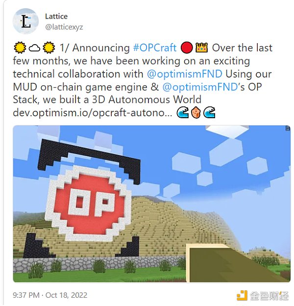 Optimism與Lattice合作推出基于OP Stack的元宇宙游戲OPCraft:10月19日消息,據官方消息,游戲工作室Lattice宣布與Optimism合作推出3D自治元宇宙游戲OPCraft。OPCraft運行在基于Optimism昨日宣布推出的模塊化組件OP Stack構建的自定義Rollup上,游戲中的每個元素都存在于鏈上,每個行為都是一筆以太坊業務。目前,該游戲的合約和客戶端已經開源,支持玩家在其他EVM兼容鏈上進行部署。OPCraft世界將開放兩周,北京時間11月1日7:59將停止運行,Rollup將被凍結,玩家在游戲中的創造將被永久保存。[2022/10/19 17:32:26]