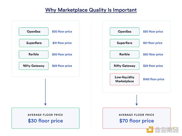NFT市場分析工具通常會從多個主流的NFT市場聚合價格數據,盡可能多地搜集數據點,以可靠地計算出NFT地板價。