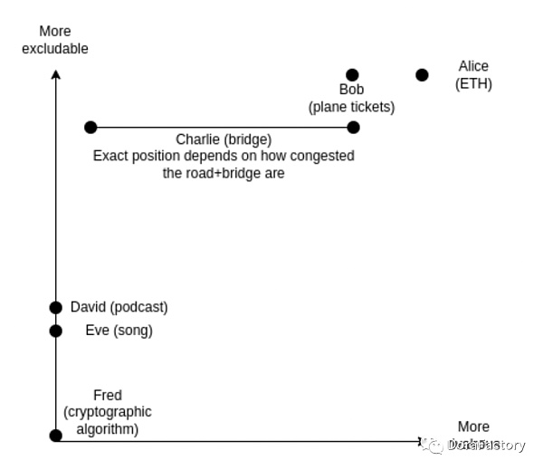 愛麗絲的 ETH 是完全排他性的(她有完全的權力來選擇誰得到她的代幣),而加密硬幣是競爭性的(如果一個人擁有特定的代幣,那么沒有其他人擁有同一個代幣)