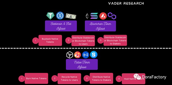 價值創造是通過生態系統的流入來定義的,開發人員/DAO 應該能夠確定所創造的總價值的百分比應該歸屬于哪個可交易資產(原生代幣 1、原生代幣 2、NFT 集合 1 等)。理想的代幣價值累積機制將取決于流入是以原生代幣還是其他貨幣接收。價值增值的時機與選擇的價值增值機制一樣重要。