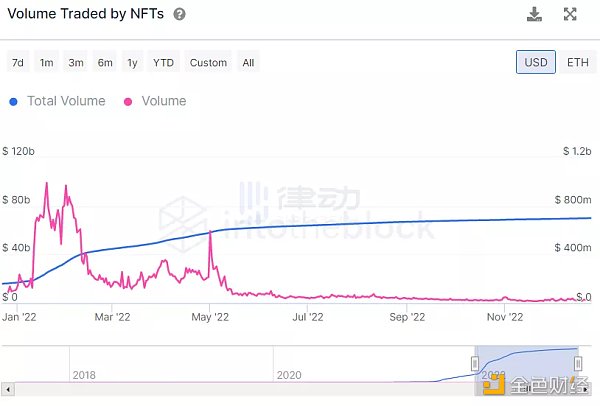 NFT 市場交易量的峰值出現在 1 月,最高單日交易量超過了 9.91 億美元。5 月 1 日也創造了一個小的峰值,當日 Otherdeed 系列 NFT 24 小時交易額超過了 3.75 億美元。隨著市場下跌,NFT 市場交易量不斷萎靡,在 11 月曾有多天的日交易量不到 1,500 萬美元。