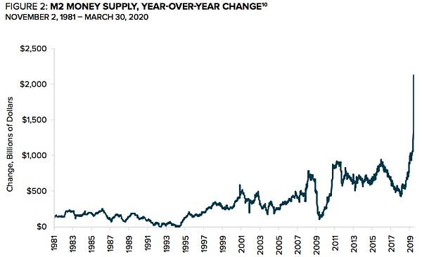 在2008年11月至2010年3月(為期16個月)的第一輪量化寬松期間,美聯儲在資產負債表上增加了1.5萬億美元。相比之下,本輪刺激,美聯儲在不到兩個月的時間里增加了超過2萬億美元。當量化寬松還沒直接作用于消費能力上的時候,通貨膨脹正在加速。這些都反應在M2上,而M2的增速正是衡量M1、儲蓄存款和市場貨幣基金的標準。
