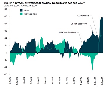 比特幣的發行模型中,不可更改的稀缺性是一個非常有吸引力的設計,可以很好地對抗貨幣貶值。在灰度之前的報告《用比特幣對沖全球流動性風險》中,我們提供了比特幣在危機中往往是避風港的證據。比特幣與其他資產的相關性一直比較低,具備贖回特性,這是作為多樣化投資工具的重要特點。不過,從2019年到2020年第一季度,比特幣和黃金的走勢呈現高度相關,這受中美貿易關系、伊朗局勢、COVID-19帶來市場擔憂情緒的直接影響。 比特幣和黃金目前都處于歷史高位,表明比特幣更在發揮價值避風港的作用。