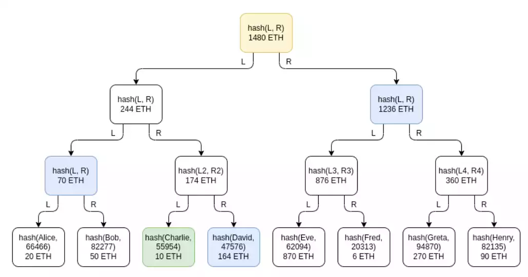 綠色:Charlie 的節點。藍色:Charlie 收到用于證明的節點。黃色:根節點,向所有人公布