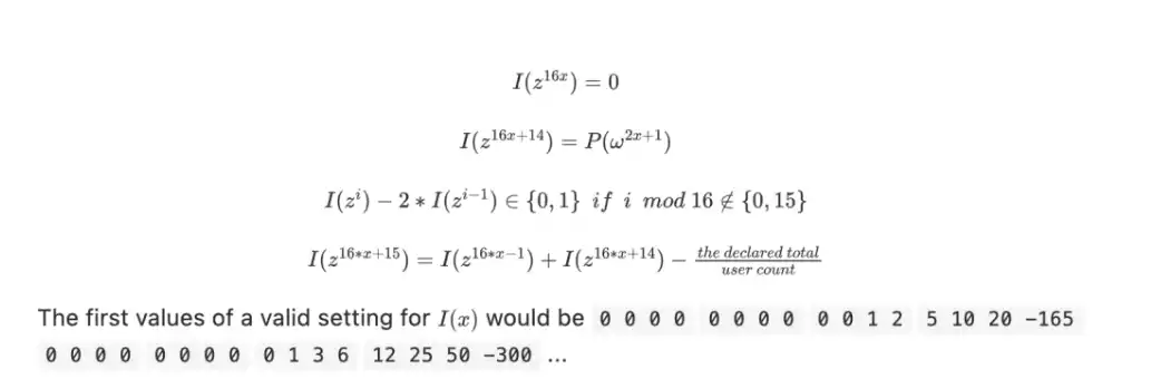 我們可以通過一個專用的 ZK-SNARK 來證明上述 KZG 中余額的總和及其非負性。這里有一個簡單的例子。我們引入了一個輔助多項式 I(x),其「構建出用戶余額的每一位」(為了舉例,我們假設余額低于 215),其中每第 16 個位置追蹤差額保證,只有當實際總額與宣稱總額相等該值才會是 0。如果 z 是一個 128 階的原根,我們可以證明方程成立: