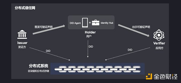 與DID相關的個人數據不上鏈,而是加密存儲在發證方,用發證方頒發的聲明來證明用戶的隱私屬性(比如姓名、年齡、職業、郵箱地址等),但需經用戶授權才能讀取。這是與中心化數字身份的區別。