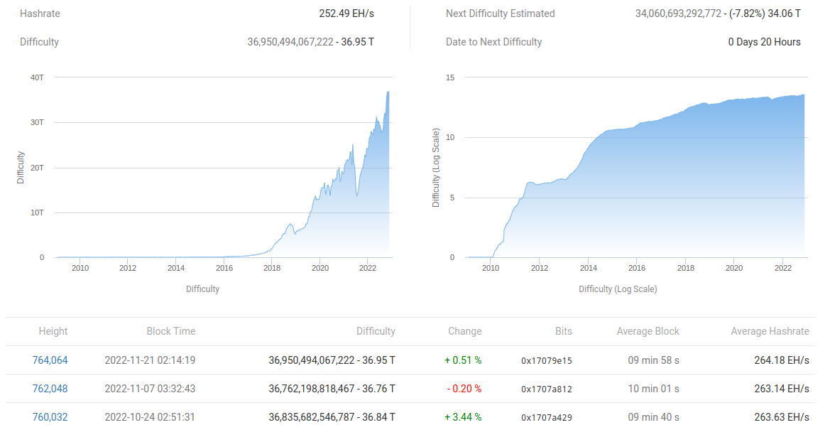 雖然在FTX和隨后的BTC價格下跌之后,算力仍在增加,但到11月底,情況開始發生變化。算力從歷史最高點附近下降,難度也隨之下降。