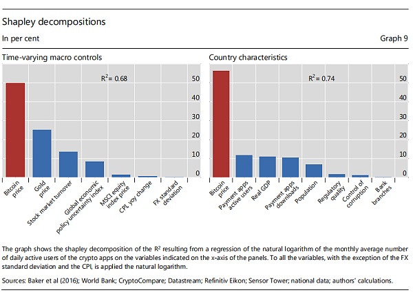為此,圖9顯示了當我們將新用戶數量回歸到比特幣價格和不同時間的宏觀控制或國家特征時,對R的平方的分解結果。這些發現表面,比特幣價格和新用戶之間的關聯不僅是高度顯著的,而且價格也解釋了新用戶進入國家和時間的整體變化。