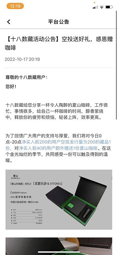 10月16日中午,十八數藏發布平臺公告稱要對在10月16日0點-24點之間凈買入前500名的用戶進行空投獎勵。17日18:49又修改公告,將前500同樣的禮品分出了4個等級。有用戶提出質疑: