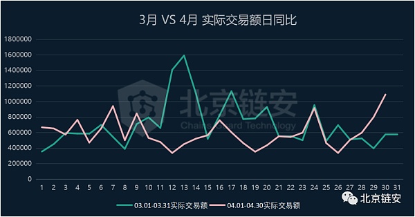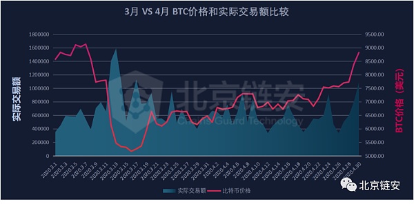2020年4月,比特幣鏈上交易額為27904397.58BTC,相較于2020年3月的33785430.55BTC,下降了17.41%。盡管4月少了一個交易日,但是整體依然可以看出4月鏈上交易額的下降,但是我們也可以看出幣價波動對鏈上交易額的影響,逐日同比來看,3月的交易額主要由“3.12暴跌”后產生,而4月伴隨月末的比特幣價格大漲,鏈上交易額也隨之拉升。