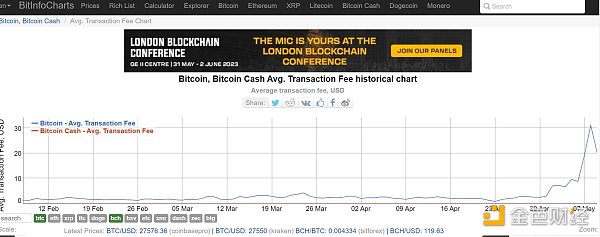 鏈上數據 BitinfoCharts 顯示, 5 月份開始,比特幣鏈上每筆平均交易費用開始出現大幅增長,從最初的 2 U 一路上漲現在為 20 U,中間曾最高沖至 30 U。