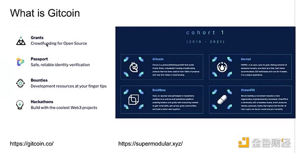 Bounties 和 Hackathons 綁定在一起,并被剝離成為單獨的產品 Buidlbox。Gitcoin 還有另外兩個產品,分別是 Kernel 和 GreenPill。Kernel 可以理解為 Web3 校友會,而 GreenPill 主要關注的是全球協作領域,也就是當全球協調失敗,該如何建立更好的協作模式,這也是 Gitcoin 聯合創始人比較關注的領域。這四個模塊最早是由 Super Modular 孵化的。