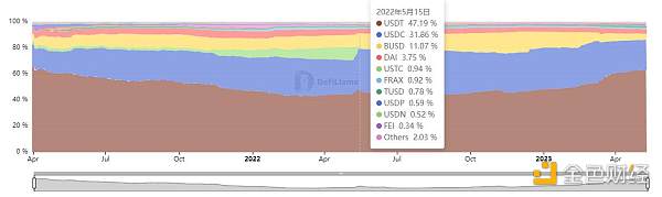 其次,算法穩定幣在 Terra 事件后迅速衰落。根據 Defillma 的數據,從 2022 年 5 月 8 日至 15 日,USDC 和 USDT 的份額約提升了 3%,算法穩定幣的市場份額被蠶食。