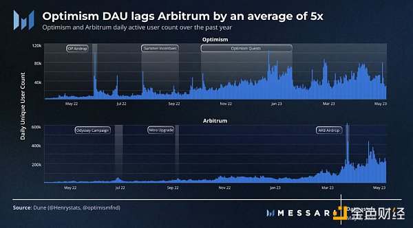 另一方面,Optimism的用戶活動與每次激勵活動呈周期性相關。該網絡在夏季激勵和 Optimism Quests 項目期間吸引了一波又一波的用戶,但每次活動結束后,用戶很快就消散了。盡管 Optimism 的用戶活動近期有所增加,但其日活躍地址數量的平均值仍然只是 Arbitrum 的五分之一。