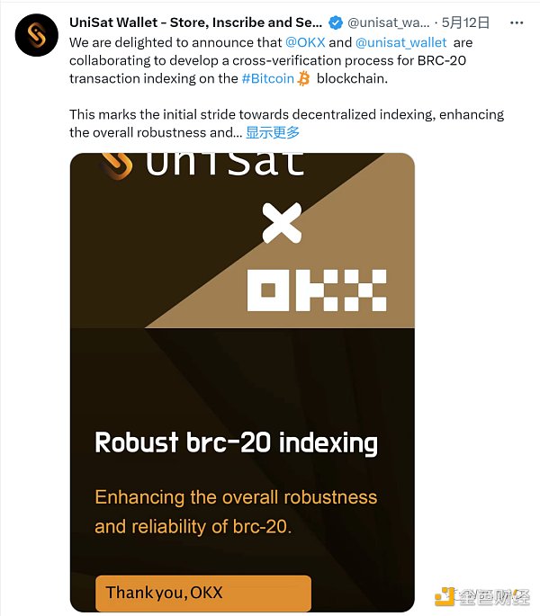 來源:Unisat 推特(https://twitter.com/unisat_wallet?s=21)因此,目前Unisat正在與OKEX、火必建立合作,共建BRC20標準及索引。