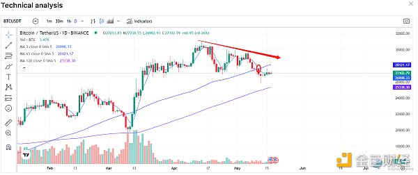 從技術圖上看,明顯可以看出比特幣短期處于一個下降通道內,5月11日,比特幣跌破中短期趨勢線MA65,進一步確認了短期見頂的趨勢信號。