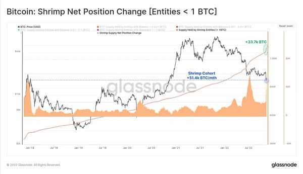 持有BTC<1的錢包僅在本周就增加了3.37萬 BTC,30天內增加了5.14萬BTC。這一水平的余額流入在歷史上排名第二,超過了2017年牛市的峰值。