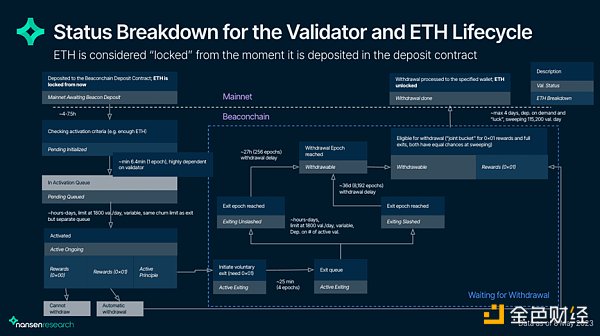 ? 鎖倉 ETH 總量:目前在信標鏈上的 ETH(包括獎勵和等待提現的 ETH) +已存入主網信標鏈存款合約但尚未記入信標鏈的 ETH。