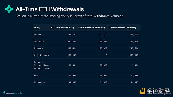 到目前為止,Kraken 一直是取款最多的實體,總計超過 647 k ETH,本金代幣占大多數。自升級以來,Kraken 的提現量約占所有 ETH 提現量的 26.3% 。這是由于最近監管機構對交易所的質押服務進行了打擊,迫使他們將質押的 ETH 退還給其平臺的儲戶。Kraken 通過他們的服務質押了大約 140 萬個 ETH,這意味著大約一半的 ETH 仍在信標鏈上。