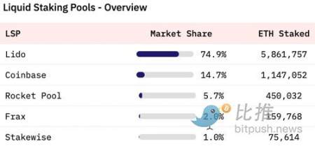 LIDO 的流動性質押衍生品(LSD)「stETH」在 DeFi 中獨領風騷; 該代幣在所有質押衍生品中具有最高的流動性,它作為藍籌流動質押品在同行中脫穎而出,Lido 控制著以太坊 TVL 的 17.6%。 每三個以太坊驗證者中就有一個 (30.6%) 屬于該協議,其質押衍生品在 LSD 市場中占有 74.9% 的絕對份額。