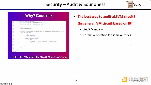 在構建zkEVM時,安全性是至關重要的。PSE 和 Scroll 共同構建的zkEVM有大約3萬4千行代碼,從軟件工程角度,這些復雜的代碼庫在很長一段時間內是不可能沒有漏洞的。Scroll 目前在通過大量的審計,包括業內最頂尖的審計公司,來審核 zkEVM 的代碼庫。