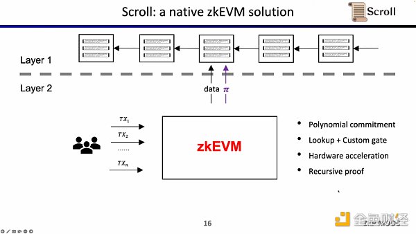 在這里我們需要證明 zkEVM,Scroll 使用的是Plonkish,Plonk IOP,以及KZG的組合。
