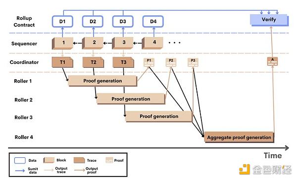 首先,定序器創建一個區塊序列,它針對每個區塊生成執行跟蹤并將其發送給協調器,同時還將交易數據提交給Rollup合約。接下來,協調器隨機選擇一個Roller來為每個區塊跟蹤生成有效性證明。然后,Roller將區塊證明發送回協調器,并且對于每k個區塊,將給另一個Roller分派一個聚合任務將k個區塊證明組合為一個單獨的聚合證明(k在這里表示區塊數量)。最后,由協調器發送聚合證明到rollup合約,以確定L2區塊。