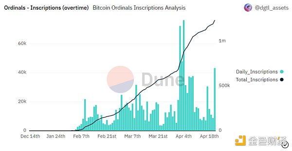Ordinals協議會為比特幣最小單位“satoshis”分配數值以實現唯一性,更具體地說,在比特幣核心全節點之上運行的Ordinals協議允許用戶將任意數據添加到比特幣交易(“銘文”)并將數據綁定到單個 satoshi(“序數”)。Ordinals協議在加密生態系統中引起了極大的關注,2023年4月8日,Ordinals協議銘文鑄造量突破了100萬枚(如下圖所示),也因此引發了關于為比特幣網絡釋放新潛力的討論。