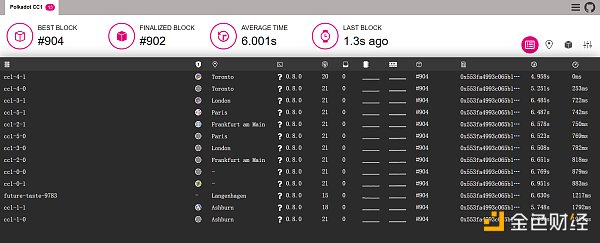 此次上線的網絡為Polkadot CC1,通過瀏覽器可以發現,出塊節點還包含了倫敦 、巴黎、多倫多等地。目前平均出塊時間約為6秒左右。