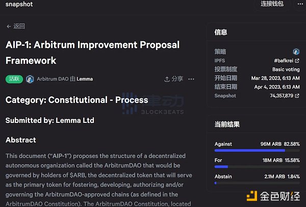 1900/1/1 0:00:00就在 ARB 代幣空投幾天后,3 月 28 日,Arbitrum 社區在 Snapshot 上發起 Arbitrum Improvement Proposal 1 (AIP-1)提案投票.