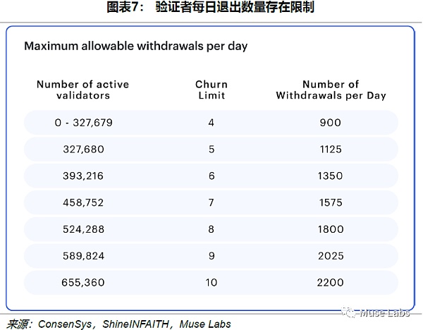 因驗證者退出網絡和取回質押本金分別需要至少5個紀元和256個紀元,故全額提款將延遲到261個紀元之后。根據當下的驗證者數量,流失限制達到8,意味著每個紀元僅允許8個驗證者,即每天最多1,800個驗證者退出網絡。每個驗證者的質押本金為32 ETH,因此日全額提款限制為5.76萬枚ETH。
