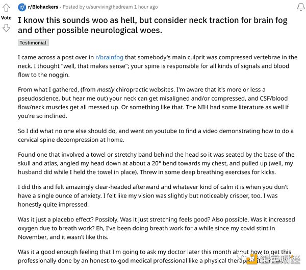 “這個概念似乎早在 1988 年就已經存在,自 2005 年以來甚至實驗室套件都在 eBay 上出售,而懷疑論者會說這相當于玩火,在自己身上試驗藥物,這樣一個 reddit 頁面和這樣的社區的存在本身就凸顯了制藥界的一個根本問題”。
