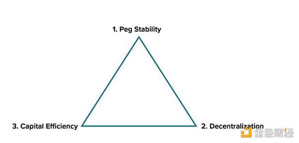 每一種穩定幣的設計都有其獨特的缺陷。在行業中,這些利弊權衡通常被稱為“穩定幣不可能三角”,因為不可能在一個設計中同時實現所有三點特性。目前的情況是,穩定幣項目只能優先考慮以下三點特性(掛鉤穩定性、去中心化、資本效率)中的兩點: