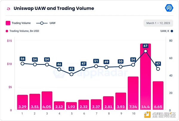 哪些 DeFi Dapp 是造成 DeFi 鏈上峰值的原因呢?Uniswap V3 是最受歡迎的 DEX 之一,其獨立活躍錢包(UAW)數量大幅增加, 3 月 11 日星期六超過了 67, 000 個,交易量達到 144 億美元,是 V3 有史以來注冊的最高數字。67, 000 個獨立活躍錢包是自 2021 年夏天以來 Uniswap Dapp 上注冊的最高紀錄。