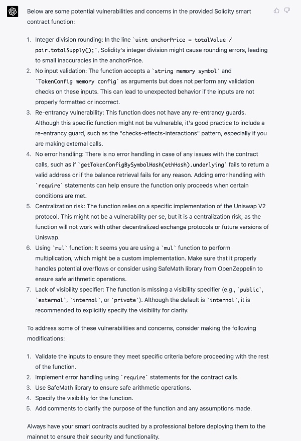 GPT 對合約代碼中基礎的簡單的漏洞具備部分檢測能力,并且在檢測出漏洞后會以很高的可讀性來解釋漏洞問題,這樣的特性比較適合為初級合約審計工作者前期訓練提供快速指導和簡單答疑。