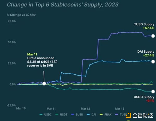 由于 USDC 與美元脫鉤,恐慌蔓延到整個加密社區,USDC 價格跌至 0.8789 美元的低點。截至當日收盤,USDC 供應涉及 19 億美元的凈流出,一夜之間從 3 月 10 日的 427.4 億美元跌至 3 月 11 日的 408.4 億美元,降幅 4.4% 。