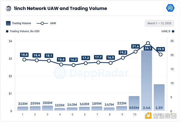 哪些 DeFi Dapp 是造成 DeFi 鏈上峰值的原因呢?Uniswap V3 是最受歡迎的 DEX 之一,其獨立活躍錢包(UAW)數量大幅增加, 3 月 11 日星期六超過了 67, 000 個,交易量達到 144 億美元,是 V3 有史以來注冊的最高數字。67, 000 個獨立活躍錢包是自 2021 年夏天以來 Uniswap Dapp 上注冊的最高紀錄。