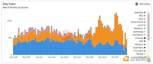 值得注意的是,盡管 NFT 交易者的活躍度很低,但交易量并沒有受到相同比例的影響,很可能是因為以太坊的 NFT 巨鯨仍堅持在 Blur 第二階段空投中 farming。