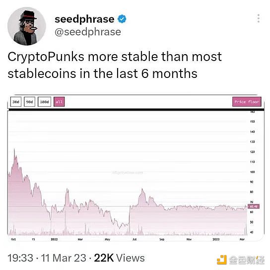 盡管 NFT 交易量整體下降,但 BAYC 和 CryptoPunks 等藍籌 NFT 的地板價幾乎沒有受到影響, 3 月 11 日僅略微低于 10 萬美元。“復蘇”速度很快,顯示出這些頂級 NFT 的韌性。