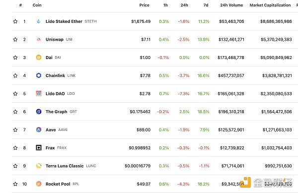 DeFi總市值及前十代幣 數據來源:coingecko