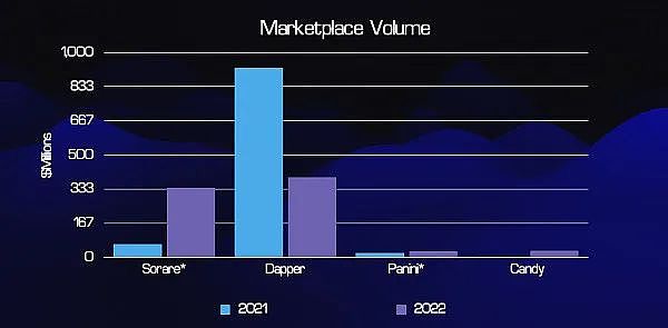 此圖表包括當時所有體育 NFT 項目的一級和二級銷售。其中,Dapper Labs 的銷售額在 2021 年和 2022 年都約為 1 億美元。