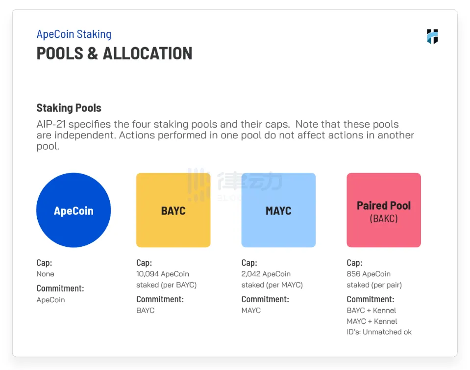 ApeStake.io 的質押挖礦系統是將用戶資產按照類別劃分為 4 個池子,即 ApeCoin 池、BAYC 池、MAYC 池、BAKC 配對池,用戶需要分別持有每個池子要求的資產去自行配對,可以描述為「獨立組合質押挖礦」。