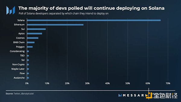 1、有大量開發人員選擇在其他鏈上進行部署應用,尤其是以太坊,但接受調查的大多數(66%)開發人員只堅持使用 Solana。