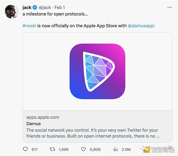 接著再來聊聊 Damus,這是最近突然火爆的一款 iOS 應用,可直接在蘋果應用商店下載。簡單地說,Damus 是一款去中心化的推特,它的出名開始于推特聯合創始人 Jack Dorsey 在推特上對它的推廣,如下圖:
