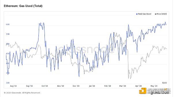 此外,數據顯示,以太坊上的Gas使用量已達到歷史最高水平。這表明在以太坊2.0的預期下,以太坊區塊鏈網絡上的用戶活動水平正在飆升。